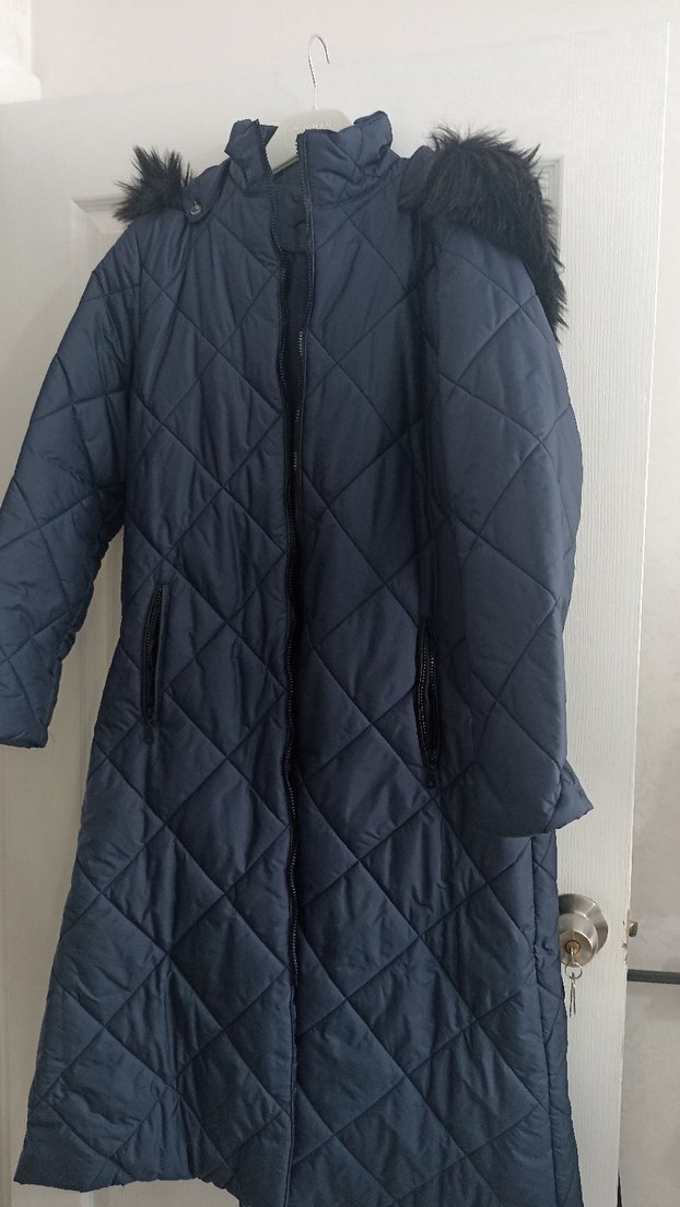 Kadınlar için uzun lacivert kışlık mont, yakasında kesik yaka ve omuzlarda kürk detaylı. Yumuşak ve sıcak kumaştan, günlük kullanıma uygun regular fit.