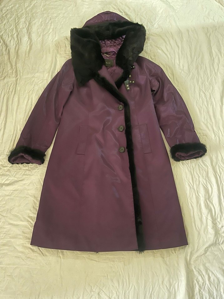 Kürklü Uzun Mor Kadın Kaban Boy 102 Cm Göğüs 52 cm
