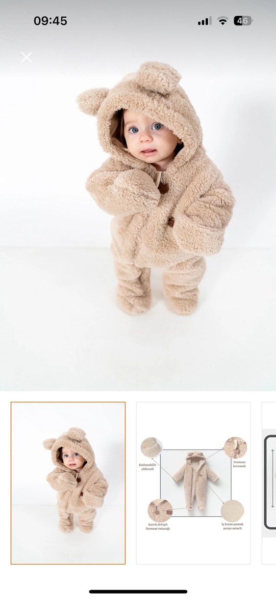 9-12 ay uygundur. Kürklü detaylı, welsoft astarli, fermuarli, kapüşonlu ve eldivenli bej renk bebek unisex tulumu, soğuk havalar için uygundur. Markası listede olmadığı için Zara seçtim