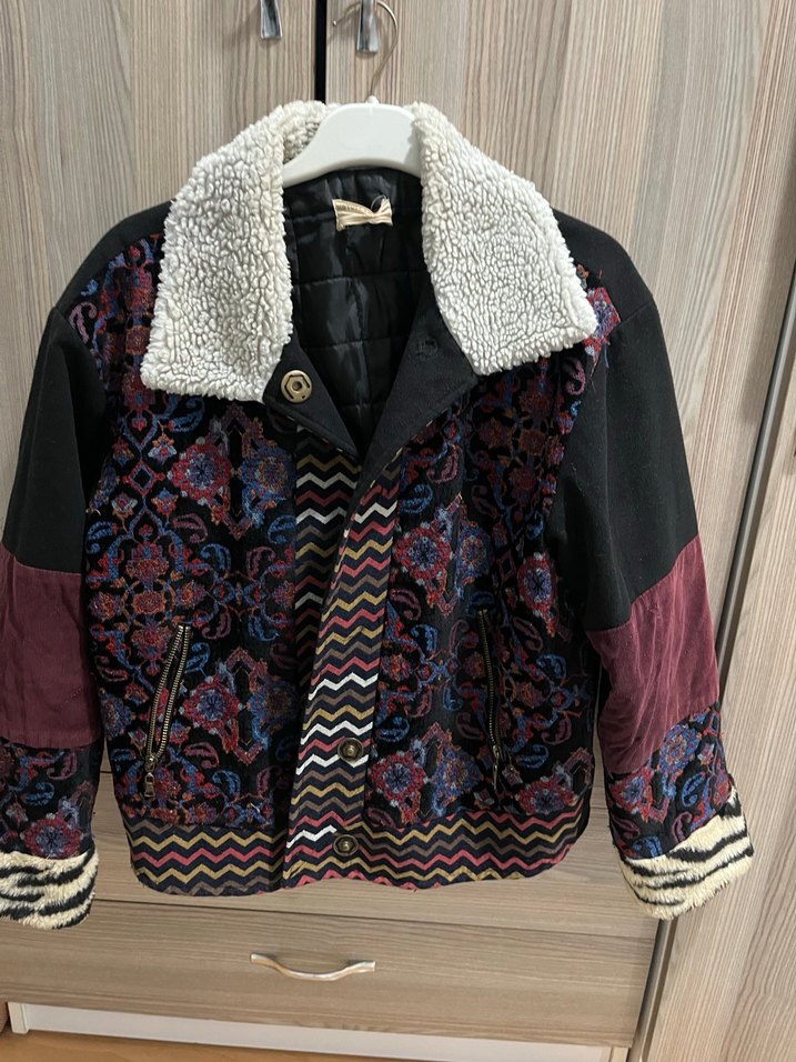 Kürklü yaka detaylı, desenli bohem tarzı kadın ceket. Uzun kollu, bol kesim, yumuşak ve sıcak kumaştan, koyu çok renkli, kısa boyda günlük kullanıma uygun. 34 beden etiketli ancak 38-40 beden uyumludur.