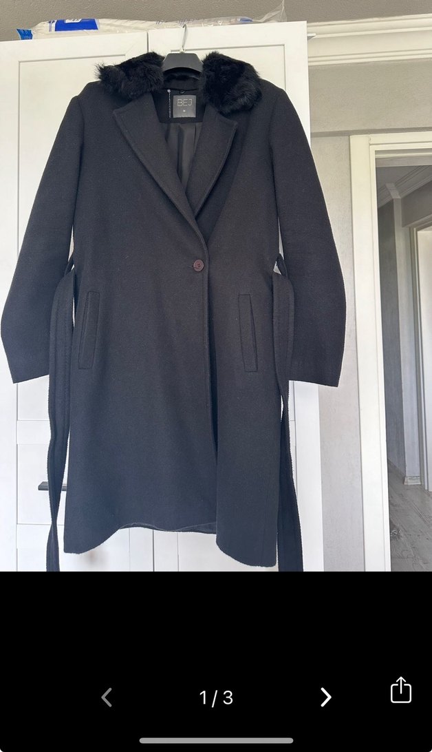 Kürklü yakalı, tek düğmeli siyah kaban. Yan cepler ve bel ayarlama kemeri bulunur. Yumuşak ve sıcak kumaştan üretilmiştir.