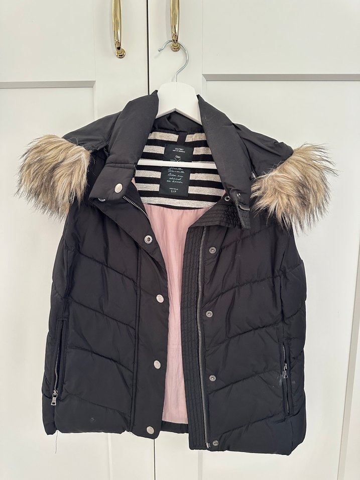 Kürklü yakalı, yüksek yakalı siyah kadın yelek. Zebra desenli iç yüzeyi ve rahat, yumuşak kumaşıyla günlük kullanıma uygundur.