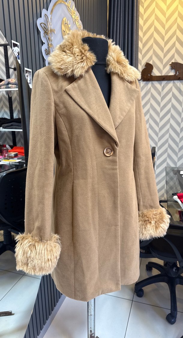 Tek düğmeli bej kaban, yaka ve kollarında yumuşak kürk detaylarıyla sıcaklık ve şıklık sağlar.