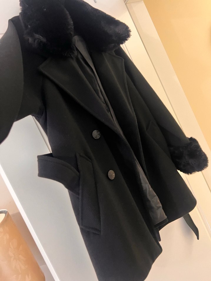 Kürklü yaka ve manşetlere sahip siyah kaban, belden bağlamalı ve sıcak tutan şık bir tasarıma sahiptir.