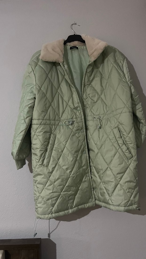 Pastel yeşil midi uzunlukta, kürklü yakalı ve kapitone desenli kadın kışlık mont. Rahat kesimi ve kayış detaylı kollarıyla konforlu bir sokak stili sunar. Hiç giymedim