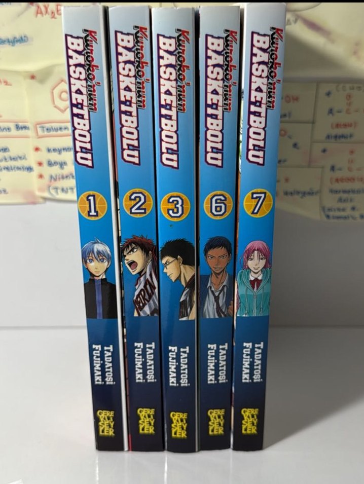 Kuroko'nun Basketbolu manga serisinin 1, 2, 3, 6 ve 7. ciltlerini içeren set, kapaklarda karakterler yer alıyor.