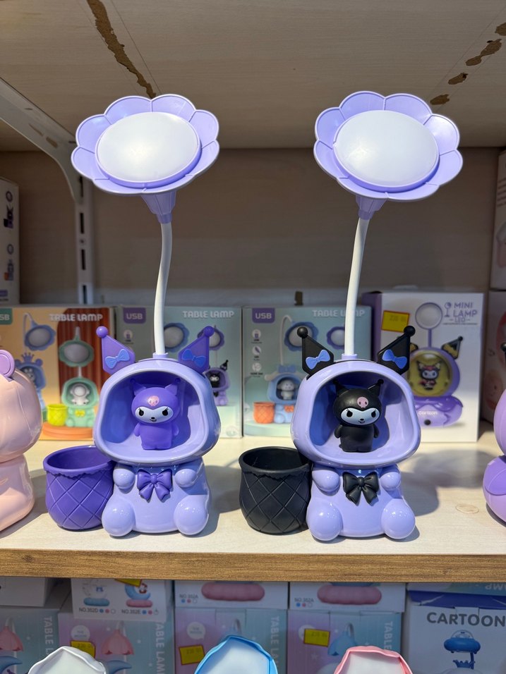 Mor renkli, ayarlanabilir çiçek şeklinde masa lambası ve sevimli karakterli kalemlik içerir.