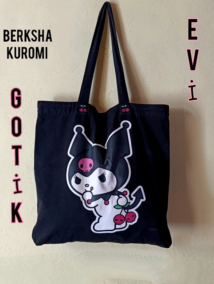 Berksha Kuromi baskılı siyah pamuk tote çanta, fermuarlı ve uzun saplı. Günlük kullanıma uygun, goth punk tarzında.