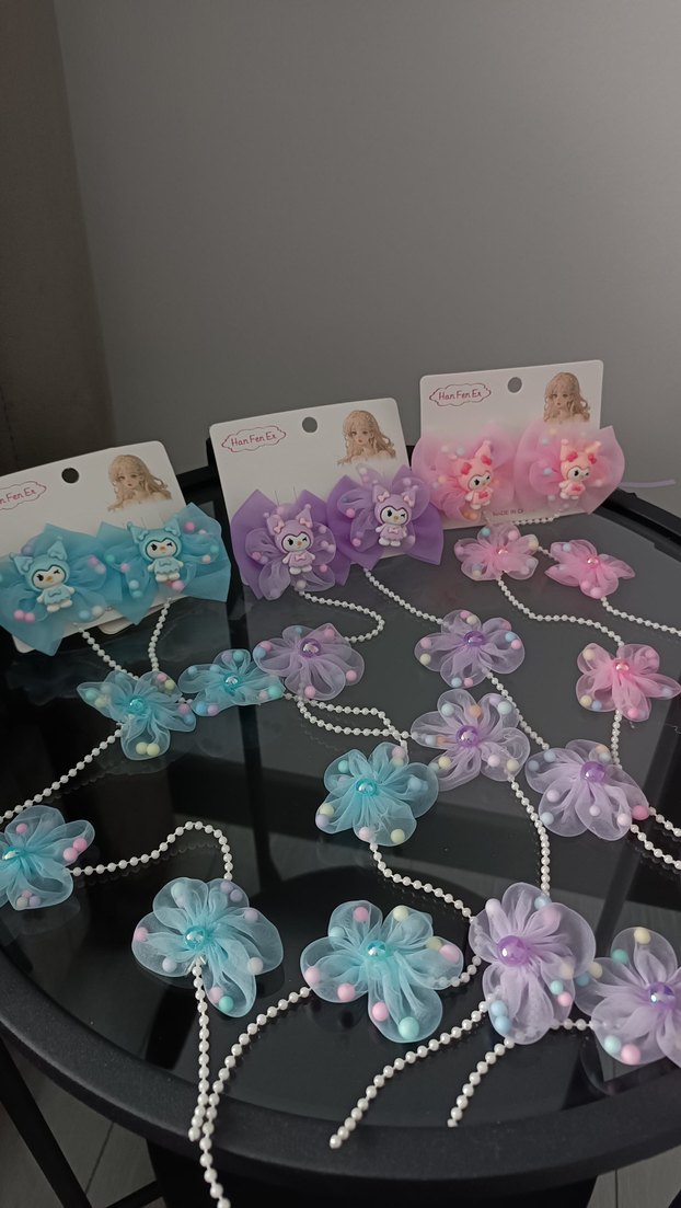 kurumi Boncuklu detaylı, çiçek desenli ve renkli çocuk saç tokaları. Mavi, mor ve pembe renk seçenekleriyle bohem tarzda.kuromi#