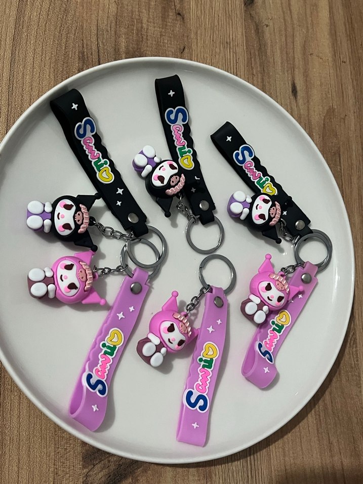 Elastik bantlı, renkli pembe anahtarlıklar; punk tarzı sevimli karakter figürleri ve canlı desenler içerir. Rock punk havası için uygun.