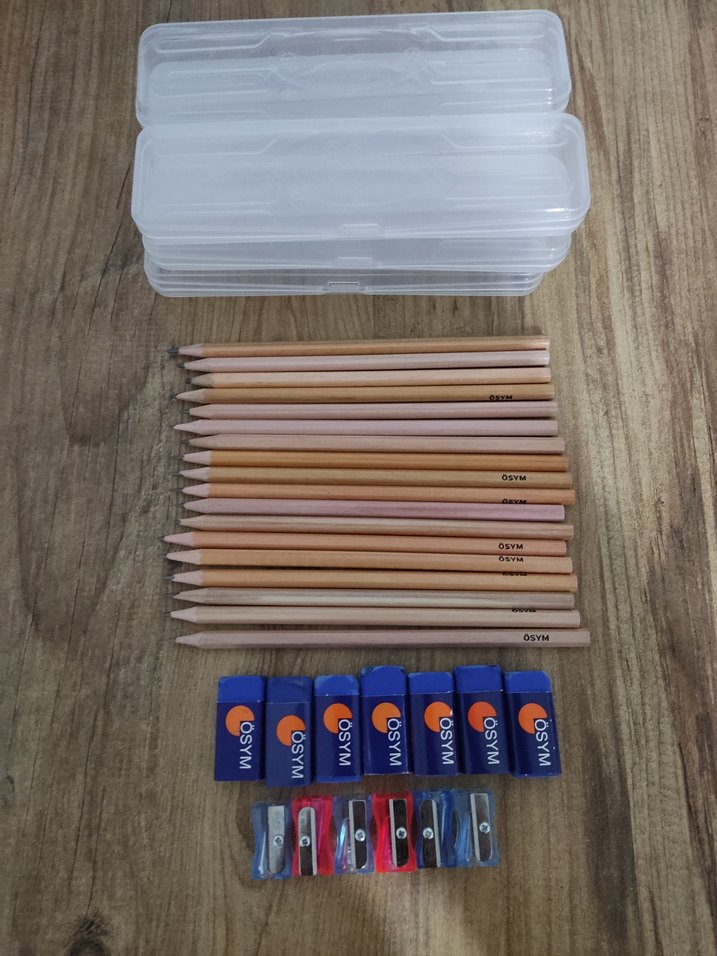 18 kurşun kalem, 7 silgi, 6 kalemtraş, sadece sınav anında kullanıldı. 31 adet