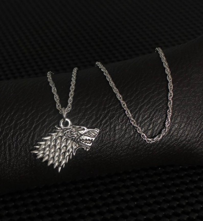 Uzun uzunlukta, zincir detayı ve gotik kurt figürlü gri kolye, rock punk tarzına uygun günlük kullanım için ideal.