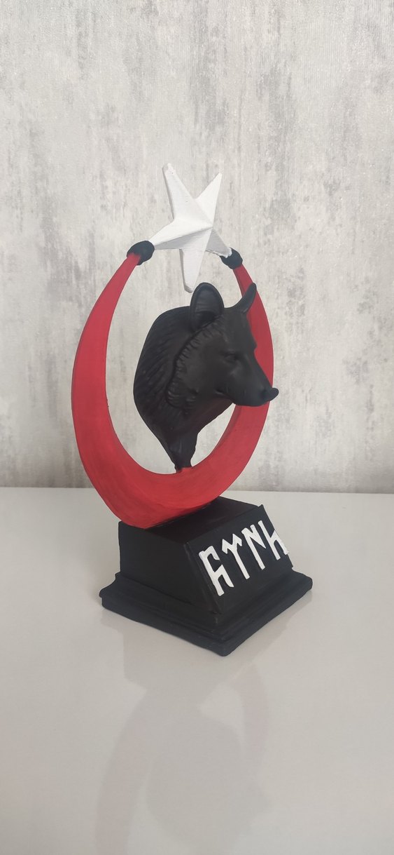 Kırmızı hilal içinde siyah kurt başı, beyaz yıldız tutan dekoratif heykel, siyah kaide üzerinde beyaz yazılarla.