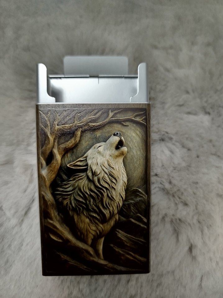 Ağaçlar ve kayalar arasında uluyan kurt figürünün detaylı kabartma tasarımını içeren sigara Tasima kabi. Kapak doğal unsurlar ve dokularla süslenmiştir.
