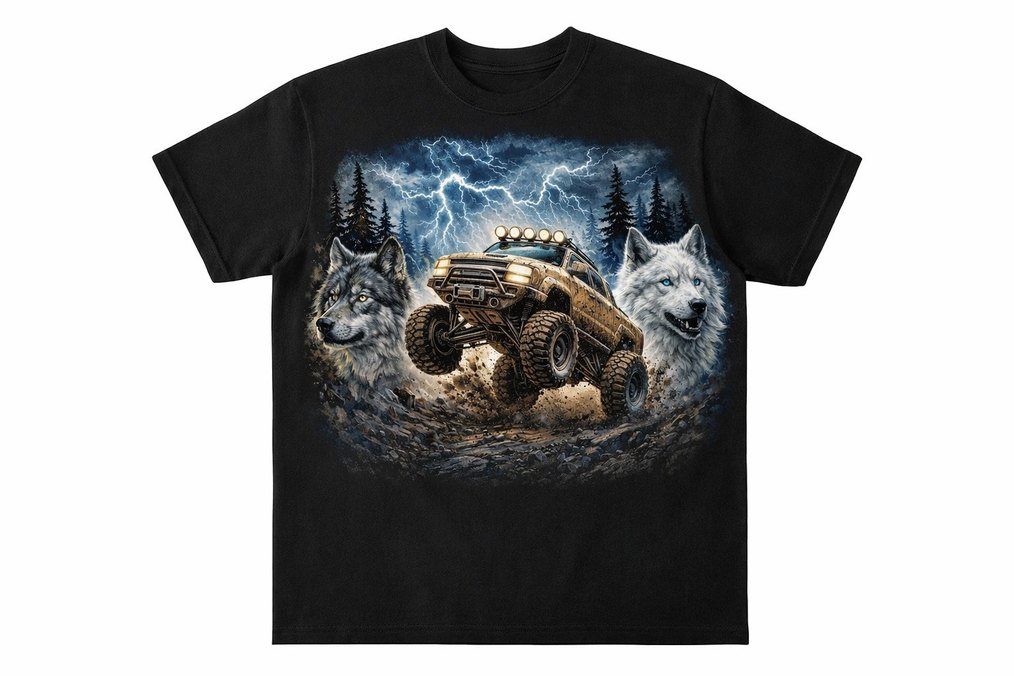 Kurt ve Off-road Araç Baskılı Siyah Erkek Tişört