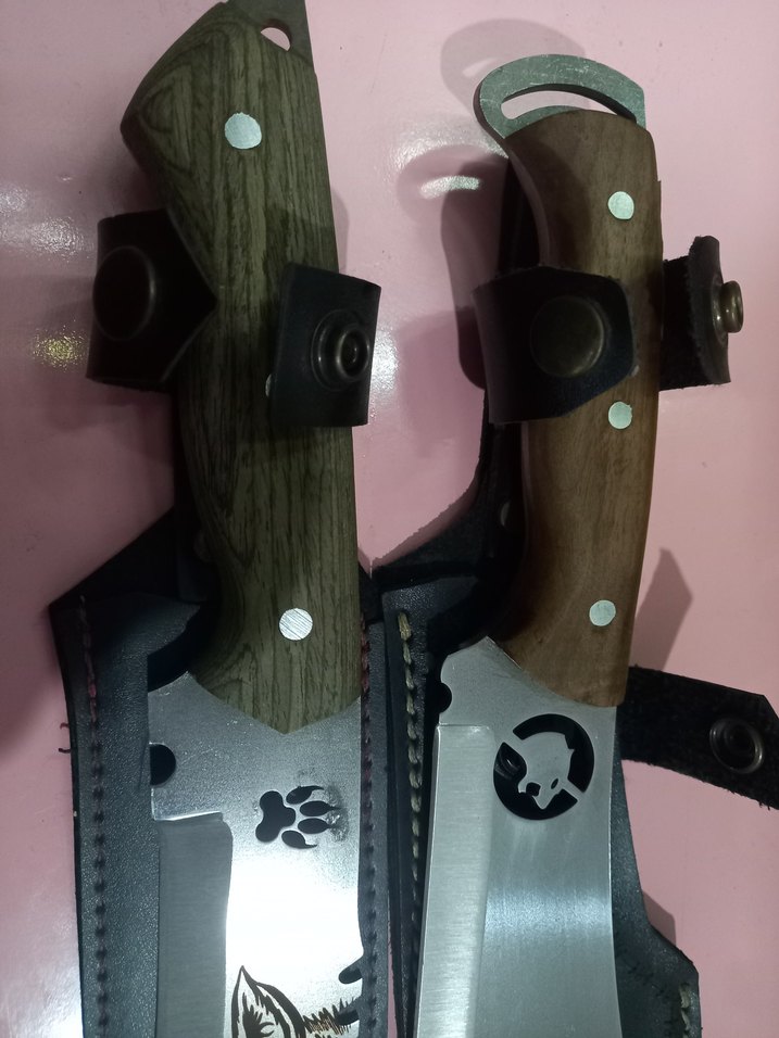 İki adet kahverengi ahşap saplı, paslanmaz çelik bıçak seti. Her bıçakta farklı hayvan figürleri ve siyah deri kın bulunur.