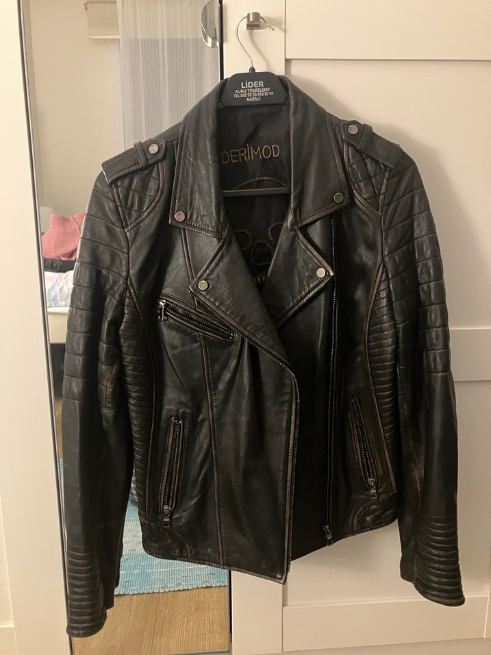 Derimod markalı koyu kahverengi deri biker ceket, yaka detaylı, normal kesim ve askılı kollu, grunge punk tarzında. Kuru kafa işlemeli