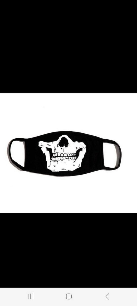 Yumuşak ve yıkanabiliir nefes alabilen kumaştan yapılmış, beyaz kuru kafa desenli siyah yüz maskesi.
