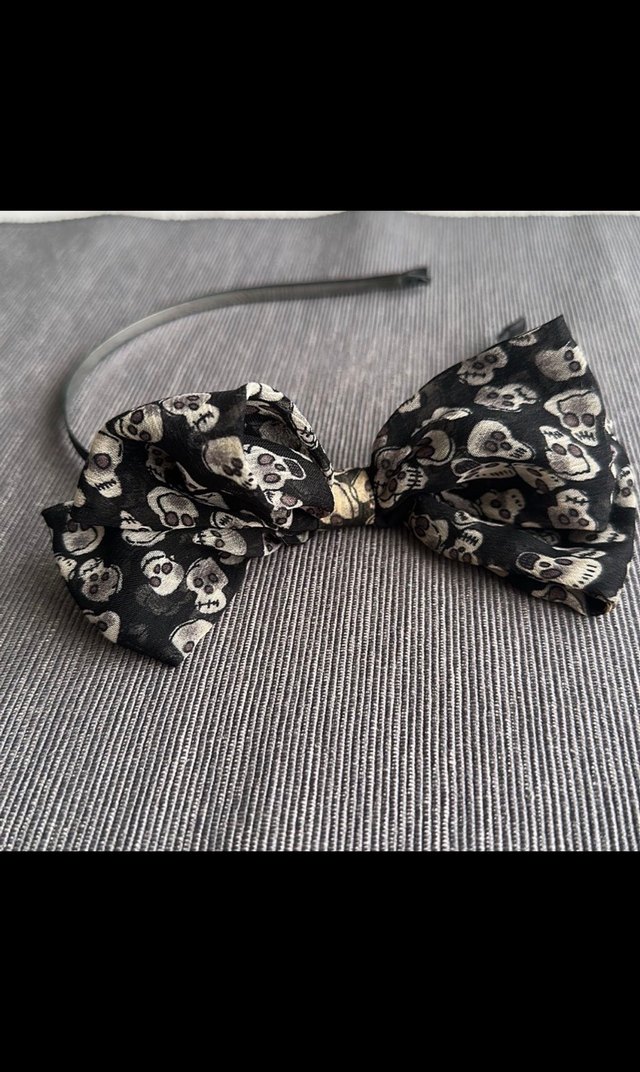 Siyah sentetik kumaştan yapılmış, kurukafa desenli fiyonk detaylı taç, Gotik ve grunge punk tarzını yansıtır.