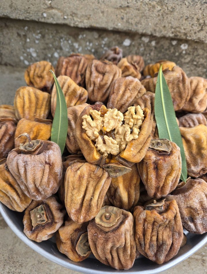 İçi ceviz dolu kurutulmuş cennet hurması karışımı, doğal ve besleyici bir atıştırmalıktır.