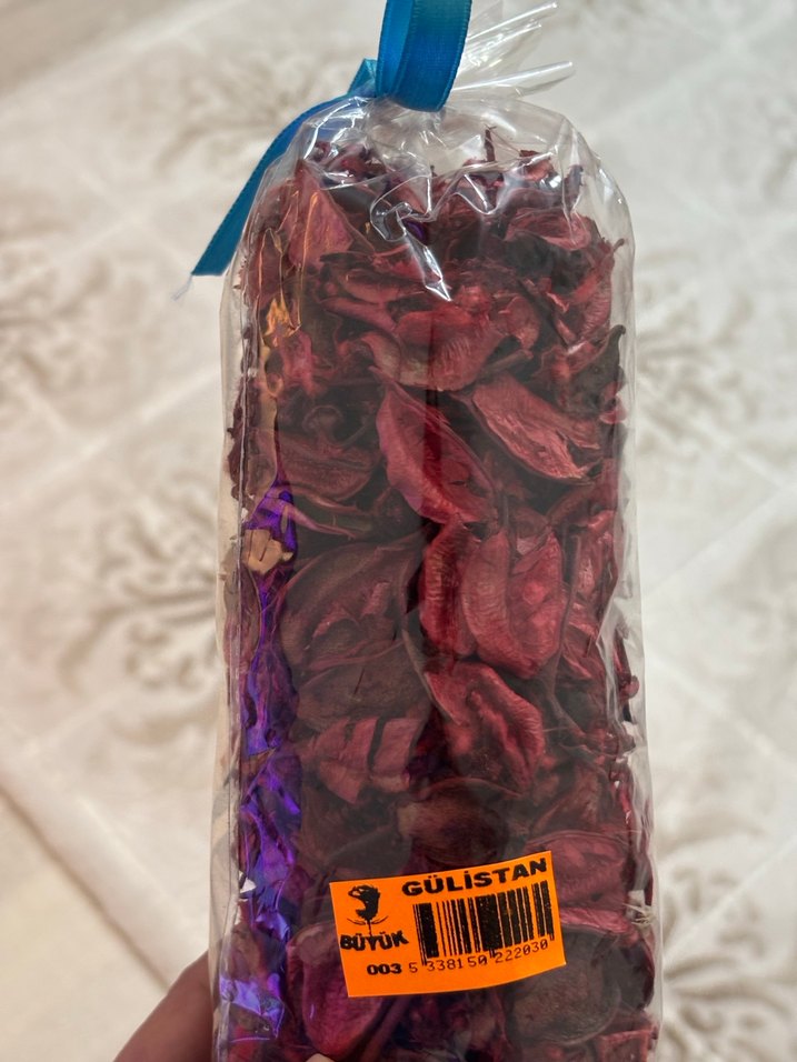 Mavi kurdeleli şeffaf poşette doğal koku için kurutulmuş gül yaprakları. Etiket üzerinde 'Gülistan' yazıyor.