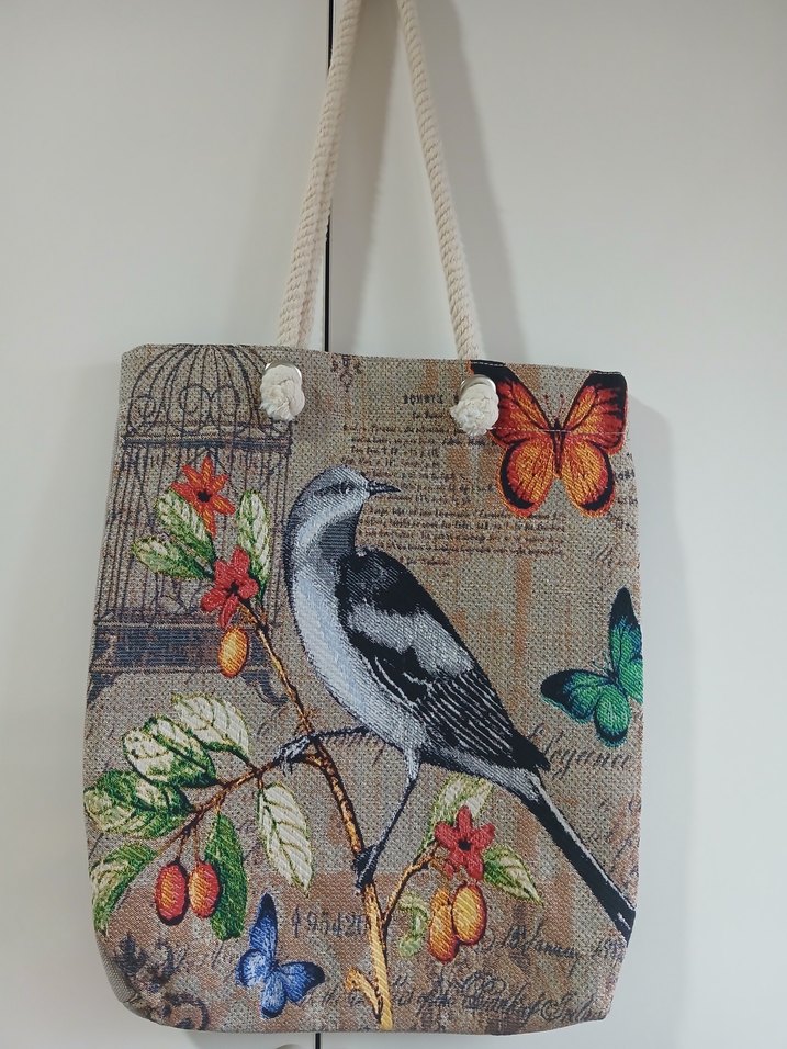 Dükkanımızı kapattık kalan ürünleri satıyoruz. ÜRÜN YENİDİR. Boy: 41 cm En:33 cm Çanta ağız kısmı bir adet mıknatıslı. İçi bez astar. Bohem tarzda, kuş, kelebek ve çiçek desenli gri baskılı tekstil kadın çantası.