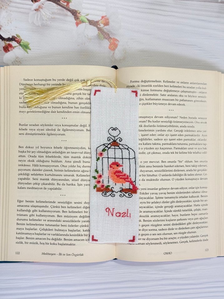 İsimşi kafeste narin bir kuş figürlü kanaviçe kitap ayracı. Yumuşak iplikle el işi ve püsküllüdür.
