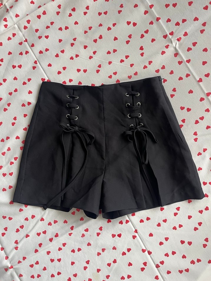 Kuş Gözü Detaylı Bağlamalı Siyah Gotik Mini Şort Etek