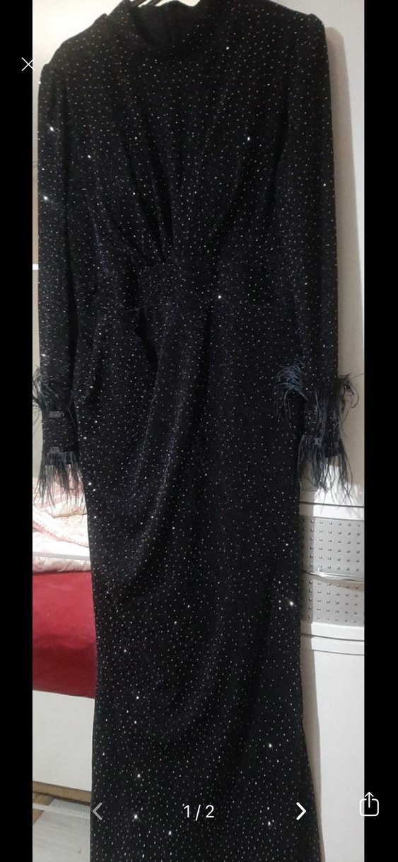Kuş tüyü detaylı siyah uzun abiye elbise