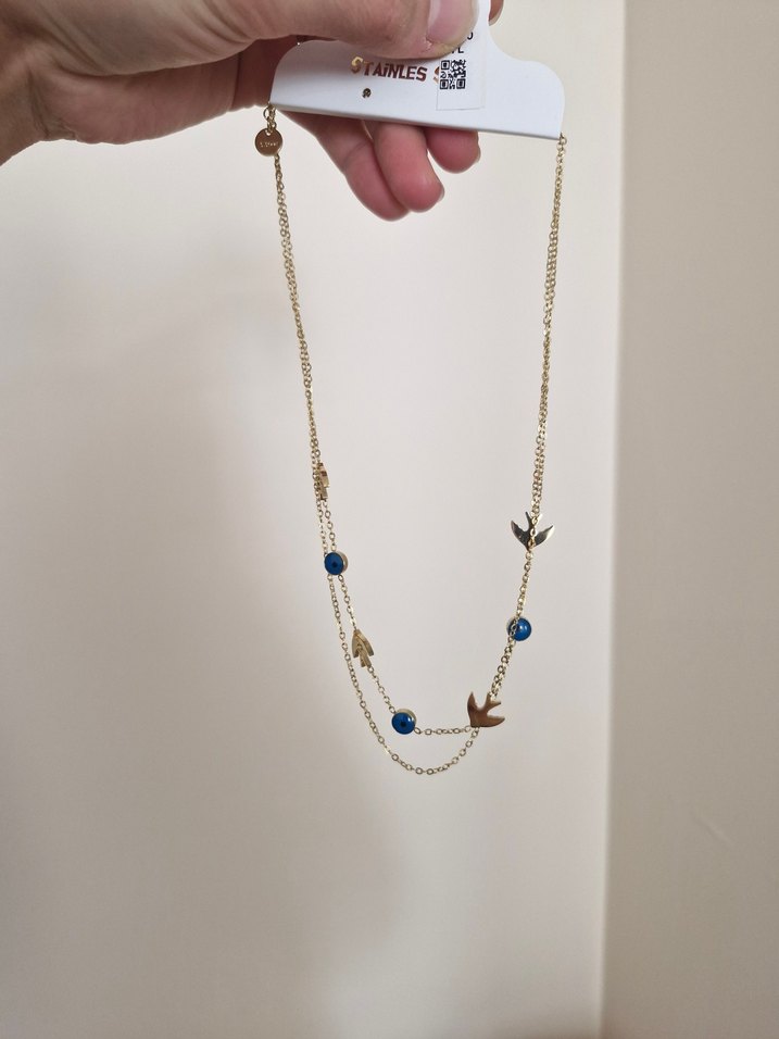 Zincir detaylı, mavi boncuk ve kuş figürlü altın renk kadın kolye, günlük kullanım için midi uzunlukta.Yeni üründür.Çeliktir.