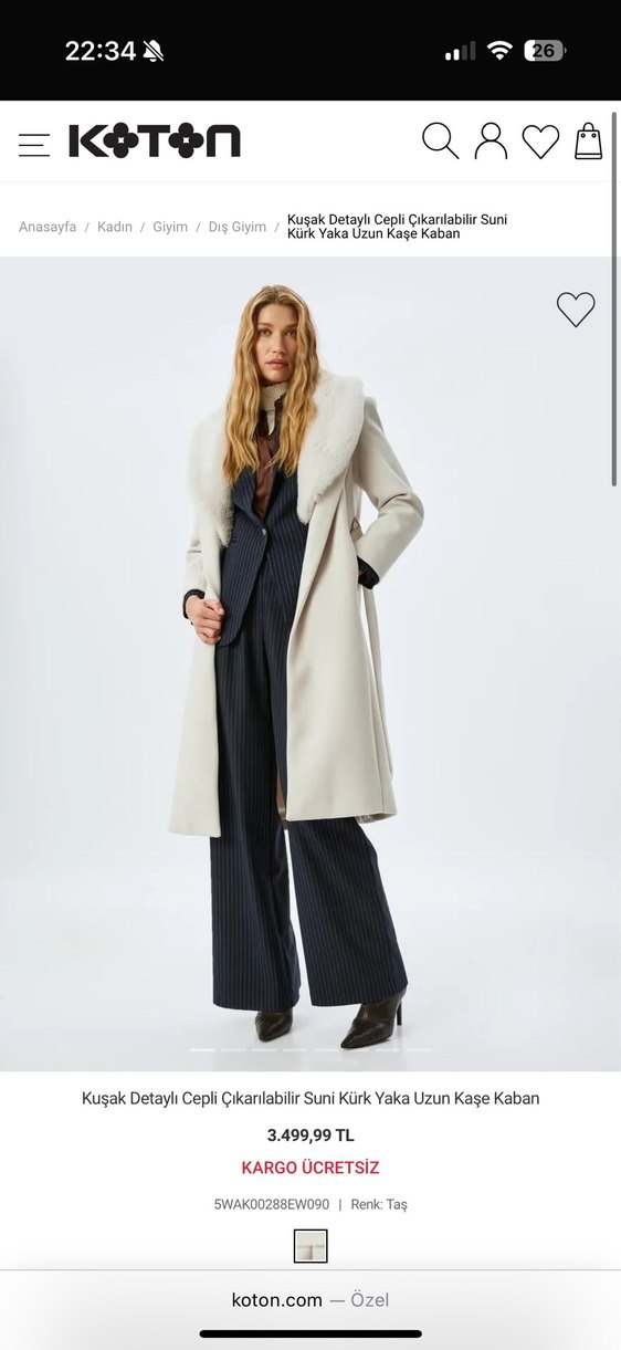 Uzun, kuşak detaylı ve cepli kaban, çıkarılabilir suni kürk yakaya sahiptir. Şık ve zarif bir görünüme sahiptir. ❄️ bir kez giyildi dar geldiği için satıyorum bu sezon ürünü, taş rengi olarak geçiyor