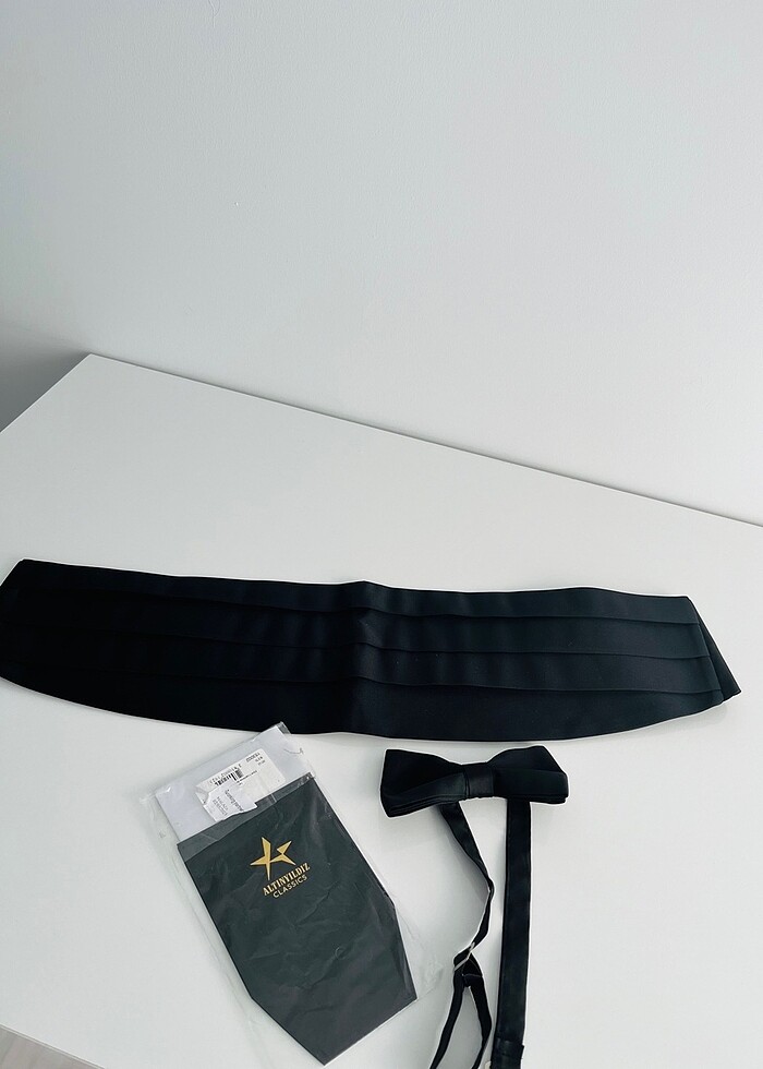 Kuşak papyon ve cep mendili hepsi etiketlidir.