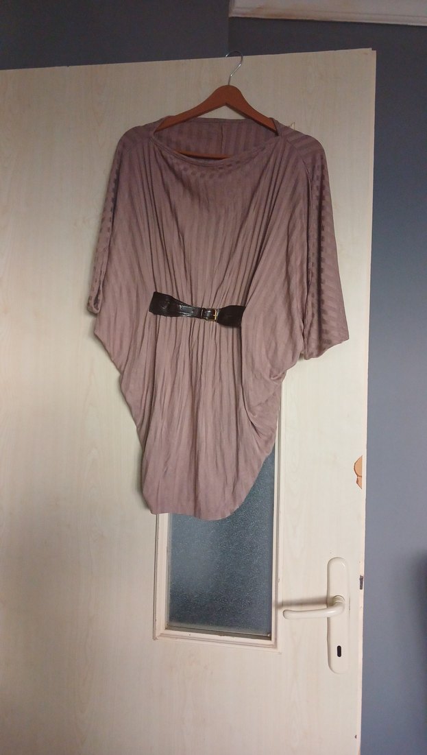 Bej renkli, kuşaklı hamile tunik. Bol kesim, kayık yaka ve askılı kolları vardır. Hafif keten kumaştan, günlük kullanıma uygun bohem tarzda midi boy.