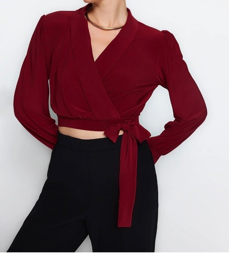 Bu kuşaklı bordo bluz, V yaka ve uzun kollu olup, ipeksi kumaştan üretilmiştir. Ofis için uygun, şık ve çağdaş bir görünüme sahiptir. Etiketi yok ama 1 kez bile kullanılmadı, çok beğenerek almıştım ama kullanabileceğim bir ortamım yok