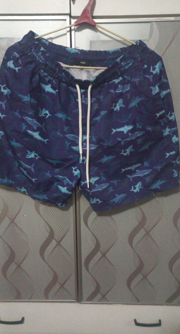 Kuşaklı bel, bol kesim ve köpekbalığı desenli mavi tie-dye mini erkek deniz şortu, plaj ve günlük rahat stil için uygundur.
