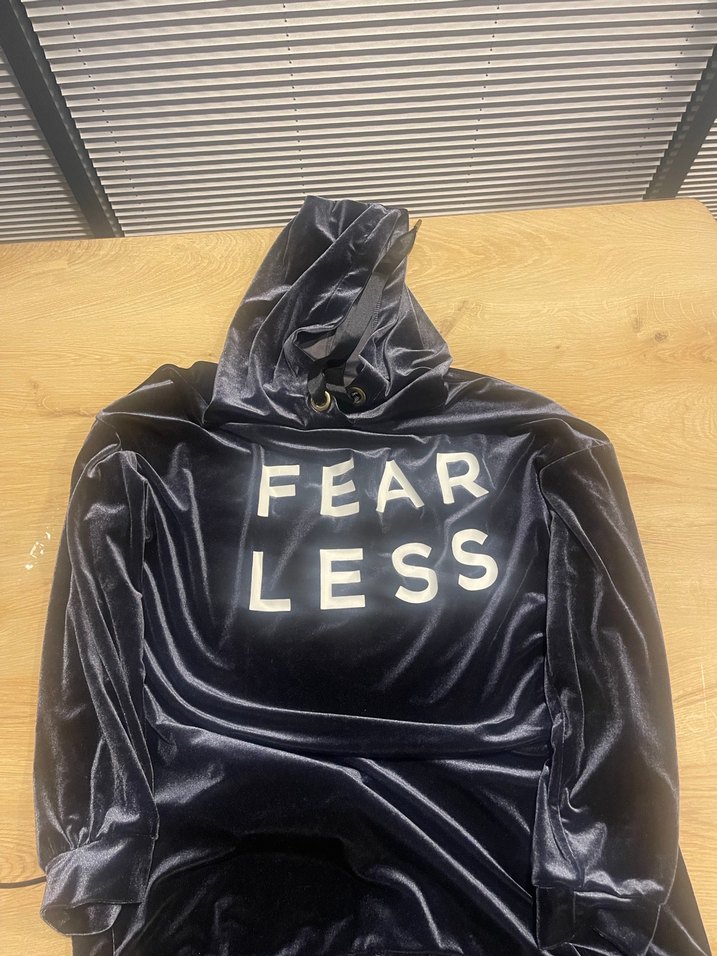 Siyah kapüşonlu sweatshirt, uzun kollu ve kuşaklıdır. Yumuşak ve sıcak kumaştan üretilmiş, önünde "FEAR LESS" baskısı vardır. Rahat kullanıma uygundur. Addax