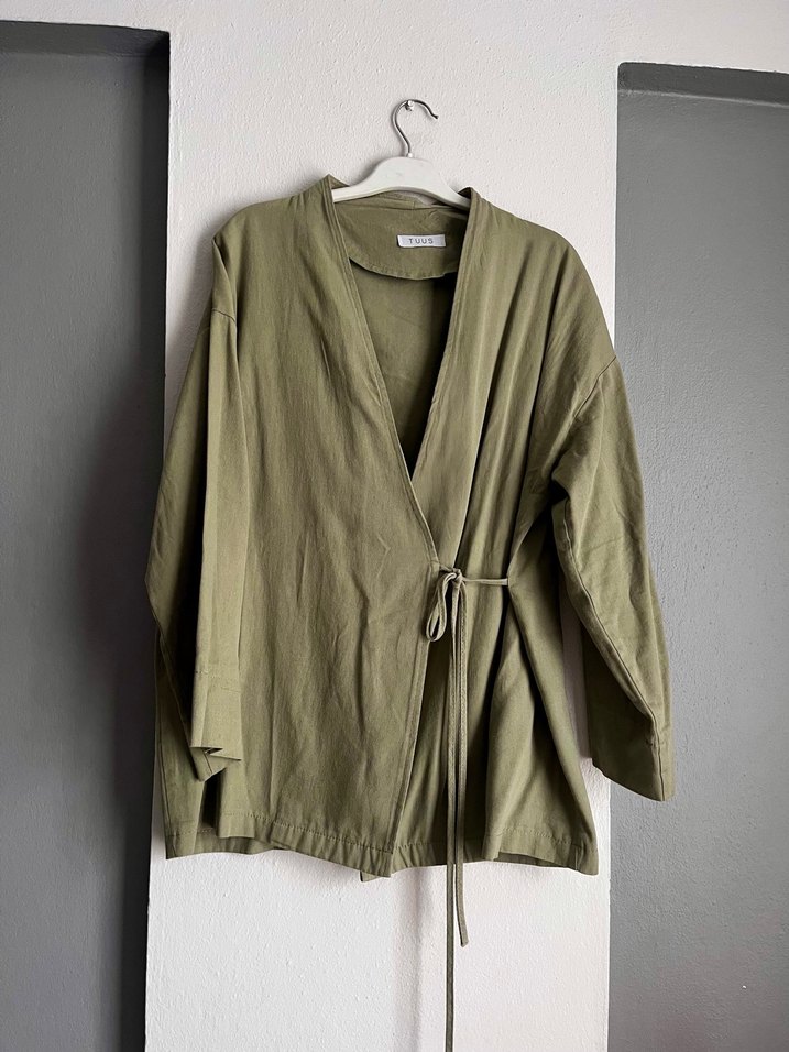 Yumuşak keten kumaştan, kuşaklı ve normal boy ceket.Minimalist, desen içermeyen, günlük kullanıma uygun.