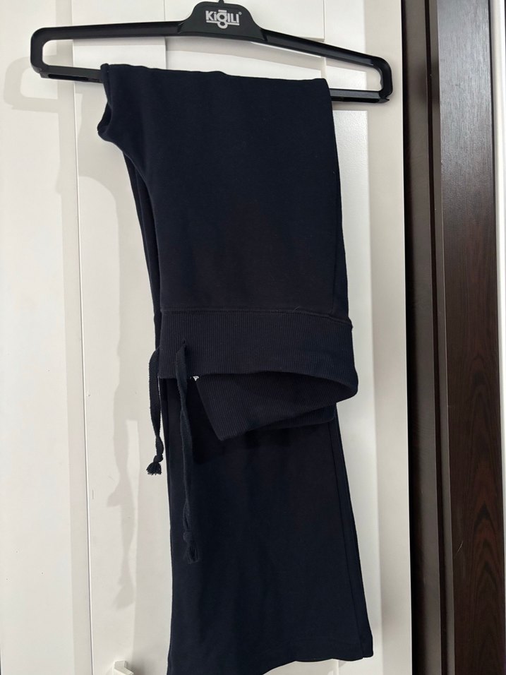 Yumuşak ve sıcak kumaştan üretilmiş, kuşaklı ve bol kesim koyu mavi eşofmanı. Spor ve günlük kullanıma uygun, sade tasarımlı midi boy pantolon.