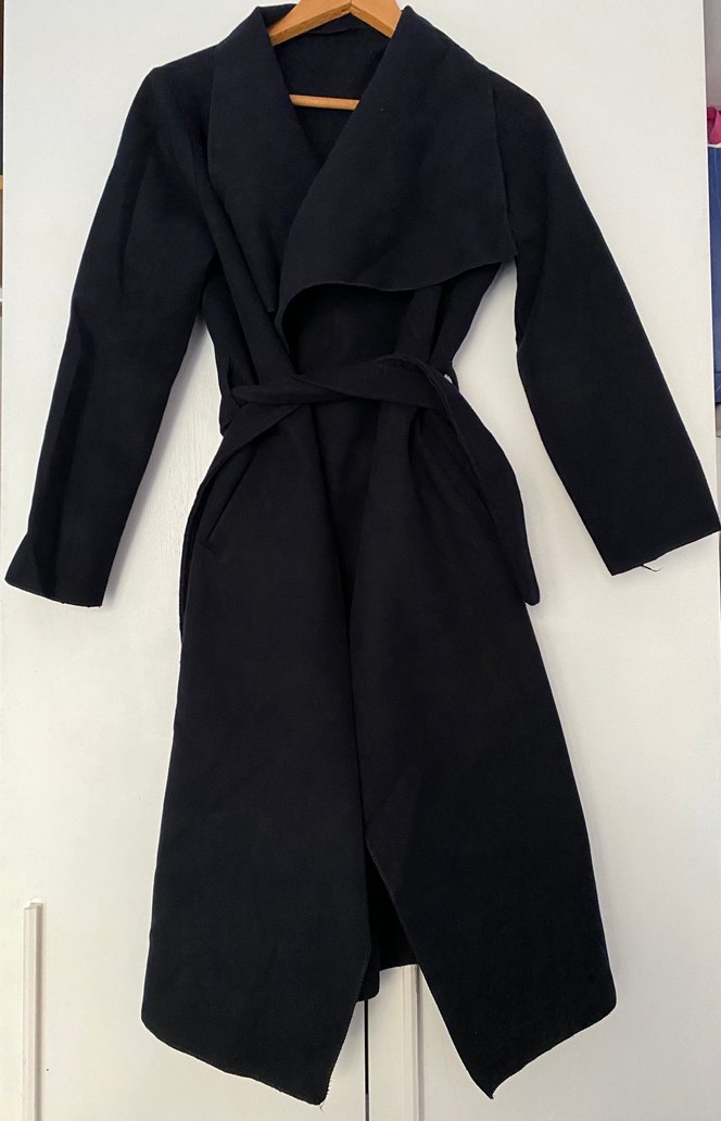 Geniş yakalı, kuşaklı lacivert kaban. Uzun kollu ve yan cepli, yumuşak kumaştan üretilmiştir. Astarsızdır.Hiçbir sorunu yoktur.L bedene kadar kullanılabilir