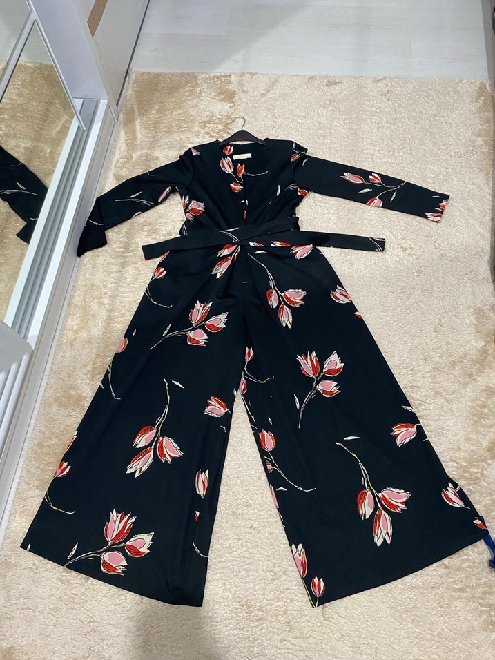 Siyah çiçek desenli, uzun kollu, kuşaklı kadın tulumu. Salaş kesim ve saten dokulu kumaşla bohem ve rahat bir tarz sunar. Günlük şıklık için uygundur.