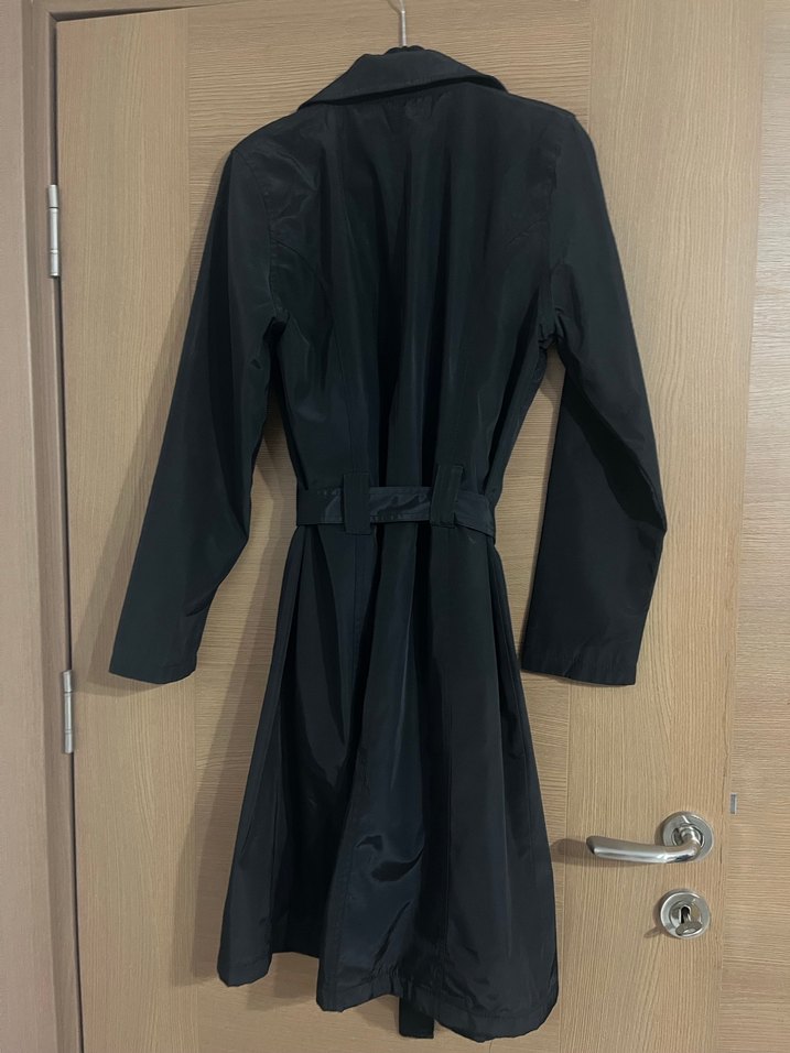 Kuşaklı, siyah ve uzun kollu trençkot, notched lapel yaka ve dar kesime sahiptir. Bondit kumaş minimalist gotik tarzda ve ofis kullanımı için uygundur 42 beden fakat 40 bedene daha uygundur