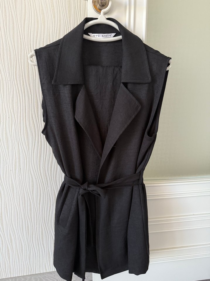 Kuşaklı, yakalı, kolsuz siyah keten yelek. Düzenli kesim, midi boyda, ofis için uygun, modern Paris tarzında. Altı da rahattır. Efil efil tam yazlık kumaştır yeni aldım hiç giymedim etiketi yok sadece