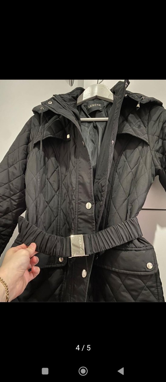 Kuşaklı, siyah midi kadın mont, sentetik kumaştan yapılmıştır. Notch yaka ve askılı kollara sahiptir, günlük kullanım için uygundur.
