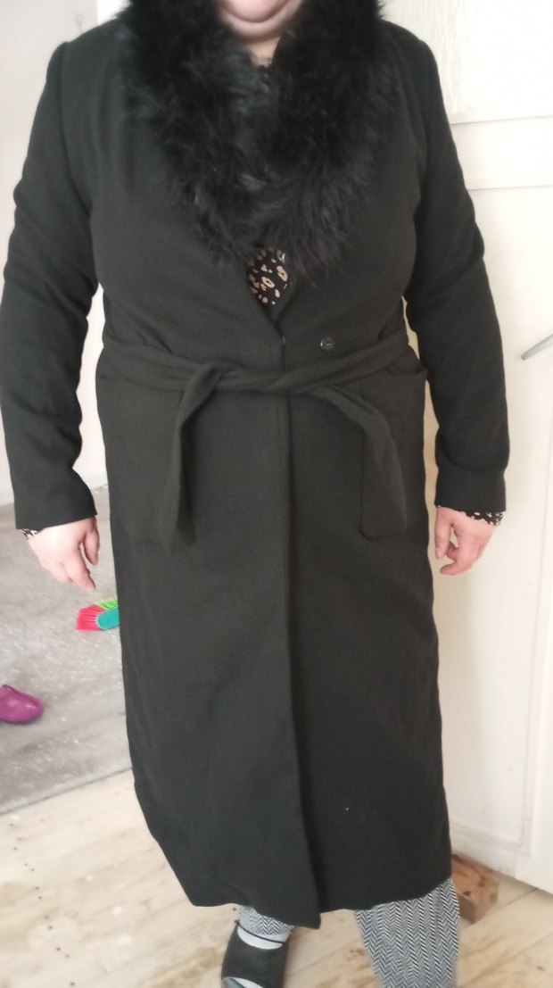 Kuşaklı ve yumuşak dokulu yakaya sahip siyah uzun kaban, rahat bir kullanım sunar.