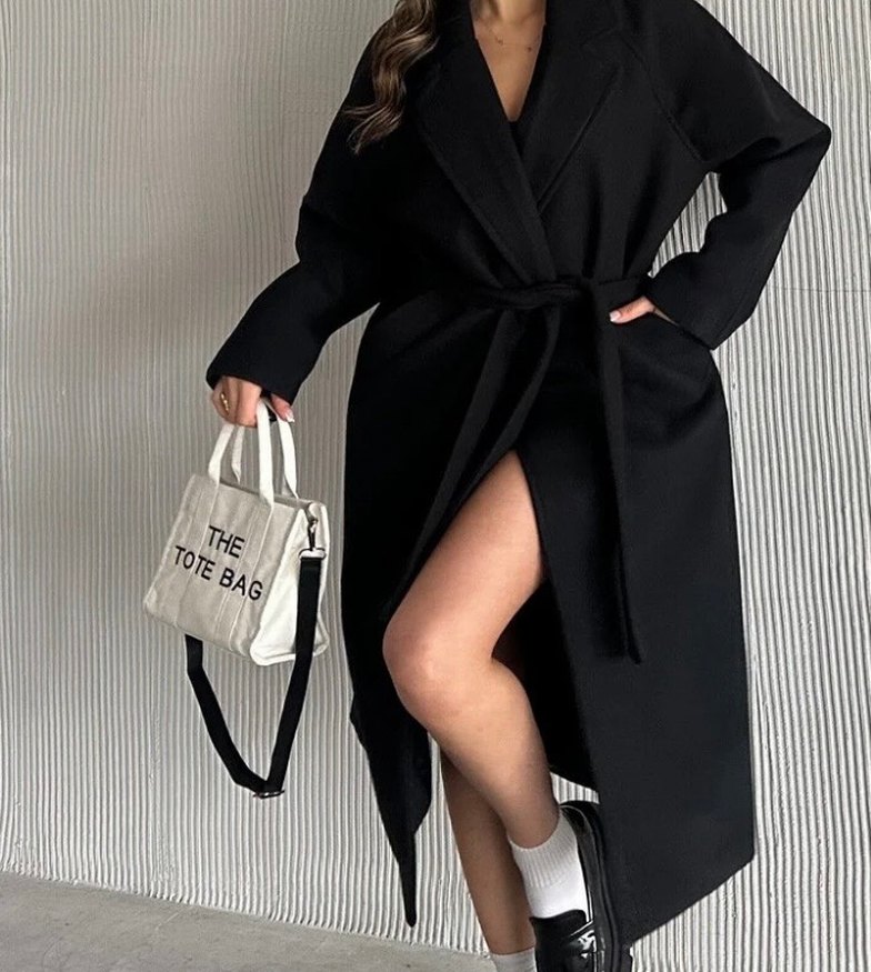 Kuşaklı, uzun siyah kaban, rahat kesim ve uzun kollu. Minimalist tasarımlı, beyaz yazılı bez çanta ile tamamlanmış.