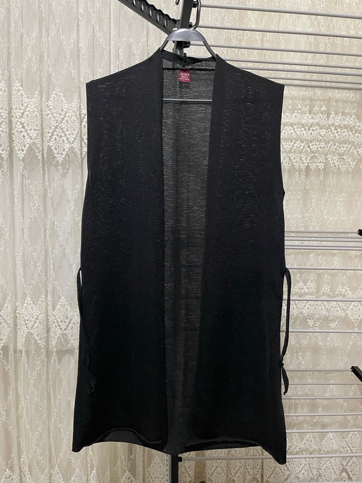 Bu siyah kolsuz yelek, kuşaklı ve kesimli yakalıdır. Hafif keten kumaştan yapılmış, regular kesim ve uzun boydadır. Günlük kullanım için uygundur.