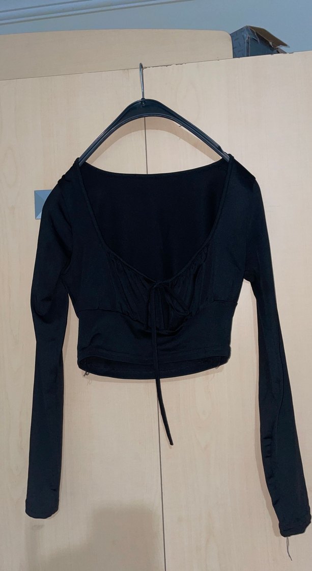 Bu boyundan kuşaklı siyah bluz, V yaka ve uzun kolludur. Yumuşak sentetik kumaştan yapılmış olup midi boydadır, günlük kullanıma uygundur.
