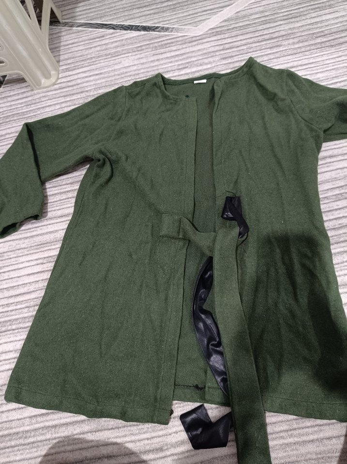 Kuşaklı bel detayı ve uzun kollu, dökümlü kesime sahip yeşil hamile ceketi. Notlu yaka ve rahat keten kumaştan üretilmiştir.