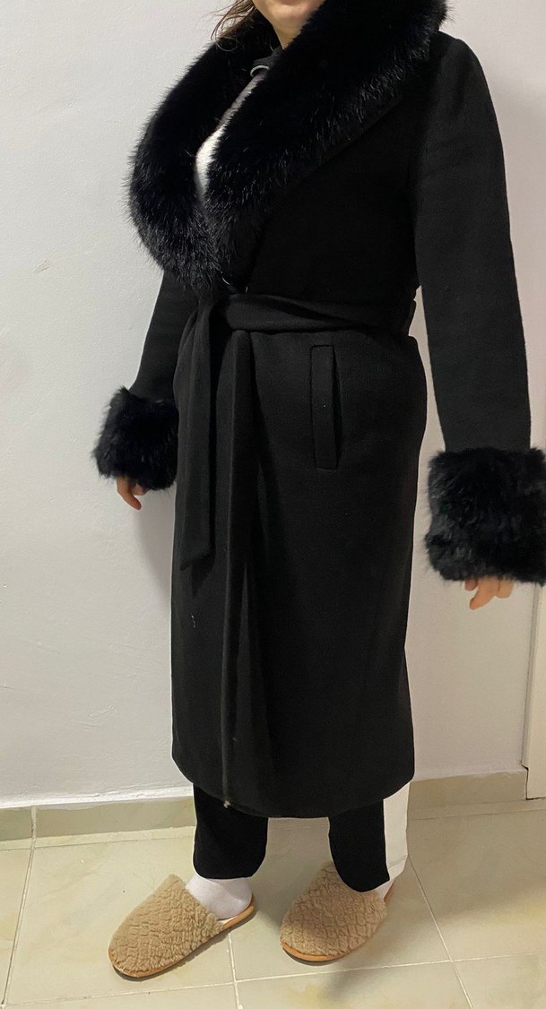 Kuşaklı, yakası ve manşetleri kürklü siyah kaban, sıcak ve şık bir görünüm sunar.