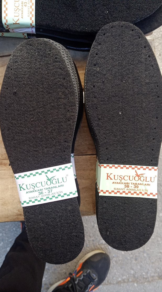 Kuşcuoğlu markalı erkek ayakkabıları için siyah tabanlar, 36-37 ve 38-39 41-42 43-44 numaralarda mevcuttur. Dayanıklı ve tamir için uygundur.